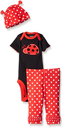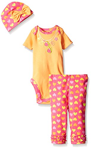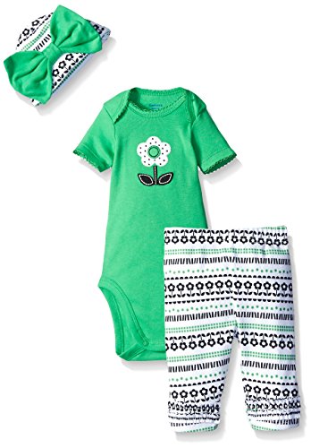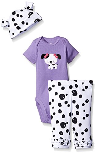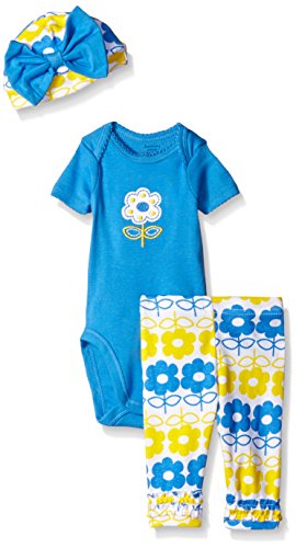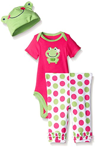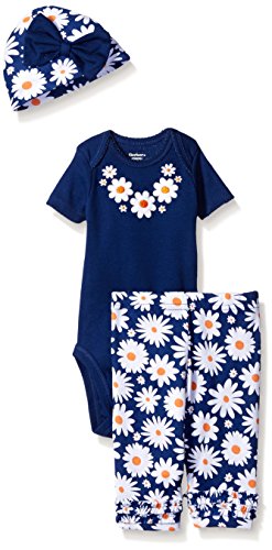 -. Binding : Apparel -. Brand : Gerber -. Department : baby-girls -. Feature : Lap shoulder neckline for easy on/off dressing / Snaps at bottom for quick changing / Gentle elastic waistband for comfort / Adjustable cuff on cap / Applique and embroidery details -. Label : Gerber Children's Apparel -. Manufacturer : Gerber Children's Apparel -. Model : 89376316A -. PackageQuantity : 1 -. ProductGroup : Apparel -. ProductTypeName : PANTS -. Publisher : Gerber Children's Apparel -. Studio : Gerber Children's Apparel -. Title : Gerber Baby Girls' Three-Piece Bodysuit, Cap, and Legging Set Whether you're going out with baby or staying inside, the Gerber newborn baby girl 3-piece bodysuit, legging and cap sets makes the perfect outfit. A lap shoulder neckline and snap closure mean easy on/off dressing, while pants feature a comfortable elastic waistband. Playwear set includes short sleeve bodysuit, pant and adjustable cap in 100 percent cotton keeps your little one cozy. Cute applique and embroidery details for your little girl. Ideal for gift giving