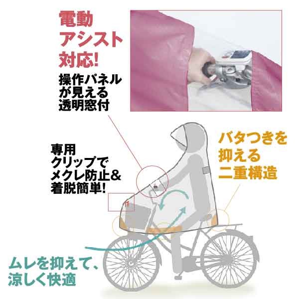 雨の日の強い味方!自転車走行専用のポンチョ! 雨の日も安心して自転車走行ができることで人気のあったポンチョを、機能性や耐久性を大幅にアップさせてリニューアル。ツバを大きく透明にし顔が濡れにくく、視界性が格段にアップ!生地もリップストップ生地を採用し軽量で強度も抜群!機能性も抜群の雨の日自転車必需品!雨の日の傘を差しての自転車走行は違反・罰せられます!前カゴ付自転車専用!電動アシスト対応!操作パネルが見える透明窓付!専用クリップでメクレ防止&着脱簡単!バタつきを抑える二重構造ムレを抑えて、涼しく快適■色