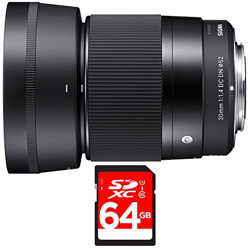 Sigma 30mm F1.4 DC DN Lens for Sony E Mount Bundle with 64GB SDXC Memory Card
