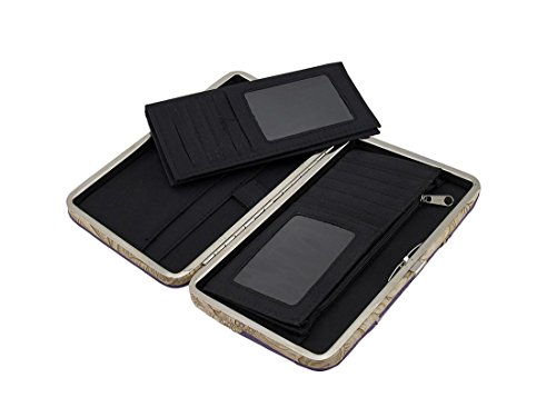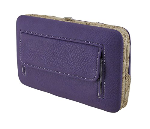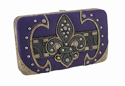 Binding : Apparel Product Description This hard-case chrome studded Western style vinyl wallet features a fleur de lis symbol, radiant rhinestones, and floral embossed trim. This 7.5 inch long, 4.5 inch high, 1.5 inch wide (19 X 11 X 4 cm) easy open snap wallet boasts a magnetic snap pocket on the back, 5 card slots, a clear-view ID window, 3 slip pockets, a zippered pocket and a removable checkbook cover inside! 0
