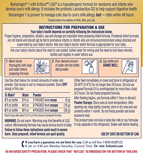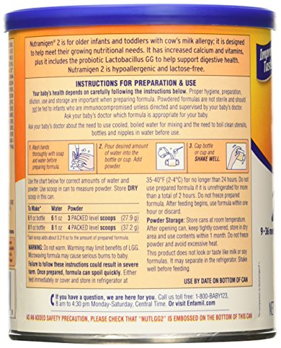 -. Feature : Nutramigen with Enflora LGG* Toddler is an extensively hydrolyzed formula for older infants and toddlers aged 9 to 36 months with cow's milk allergy. With increased calcium and some vitamins, as well as an improved taste *LGG is a registered trademark of Valio Ltd. / Designed to help your toddler continue on track for healthy progress, this formula is made with the probiotic LGG to help support digestive health. / It is hypoallergenic, lactose-free and iron-fortified. / It also has important brain-nourishing nutrients such as choline, and DHA as recommended by experts. / With increased calcium and some vitamins, as well as an improved taste, it helps meet the growing nutritional needs of older infants and toddlers with cow's milk allergy.