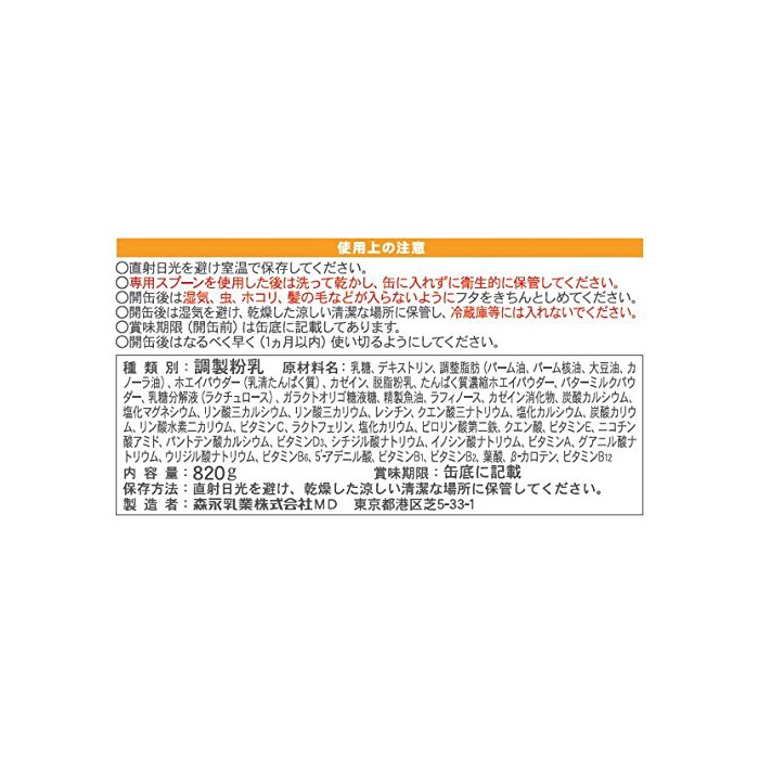 원재료:유당,덱스트린,조정 지방(팜유,팜핵유,대두유,카 노《라》유)고, 《호에이파우다》(유청단백질)고, (Kasein)카세인,탈지분유,단백질 농축《호에이파우다》,버터 밀크 파우더,유당 분해액(락《추로스》)고, 갈락토올리고당액당,정제어유,러프《노스》,(Kasein)카세인 소화물,탄산 칼슘,염화 마그네슘,인산3칼슘,인산3칼륨,고, 레시틴,구연산3나트륨,염화 칼슘,탄산 칼륨,인산 수소2칼륨,비타민C,락토페린,염화 칼륨,《피로린》산 제2철,구연산,비타민E,니코틴산 AMI 드,판토텐산 칼슘,비타민D3,시틸딜산 나트륨,inosinic산 나트륨,비타민A,《구아니루》산 나트륨,비타민B6,5''-《아데니루》산,비타민B1,비타민B2,엽산,β-카로텐,비타민B12