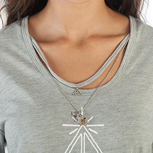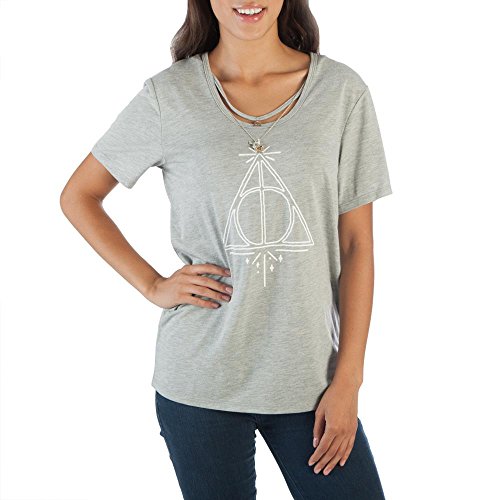 Product Description Officially licensed women's Harry Potter tee shirt. Comes in grey and features a Deathly Hallows" logo on the front with removable and interchangeable necklace with charms. Made from a blend of cotton and rayon. 0
