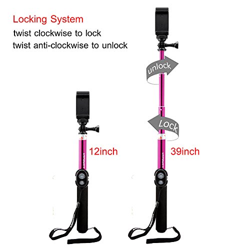 - Feature : NOTE: Unscrew the top to the right to extend the monopod, twist the top to the left to tighten the monopod. REMOTE CONTROL IS ONLY FOR SMARTPHONES. / COMPACT ACCESSORY WITH HUGE REACH - 12 / LIGHTWEIGHT AND EASY TO CARRY: The lightweight aluminum construction of the pole makes it incredibly light and easy to carry in a case or backpack. / EASY TWIST AND LOCK EXTENSION - FULLY ADJUSTABLE LENGTH: Twist and lock system allows you to adjust the length to ANYWHERE between 12 / PERFECT FOR: Digital Camera, Camcorder, Gopro Hero 4 3+ 3 2 1 Camera, Smartphone(iPhone 6 6+ 5S 5C 5 4S, Galaxy S6 Edge, S6, S5 S4 S3 Note 3 2, Nexus 4, HTC One, One 2 and Most Cell Phone).