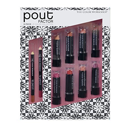 -. Binding : Health and Beauty -. Brand : The Color Workshop -. EAN : 0019333770146 -. Feature : 10 Piece Lip color collection / Includes: 8 Matte lipsticks and 2 lip liner pencils. / Pout Perfection really is the perfect lipstick collection for just about anyone. Create the most beautiful pout, from a natural nude to a classic red and everything in between. -. Label : Markwins International Corporation (Beauty) -. Manufacturer : Markwins International Corporation (Beauty) -. Model : 7701400 -. MPN : 7701400 -. NumberOfItems : 1 -. PackageQuantity : 1 -. PartNumber : 7701400 -. ProductGroup : Beauty -. ProductTypeName : BEAUTY -. Publisher : Markwins International Corporation (Beauty) -. ReleaseDate : 2017-09-12 -. Studio : Markwins International Corporation (Beauty) -. Title : The Color Workshop Pout Perfection Lip Color Collection, 10 Count -. UPC : 019333770146
