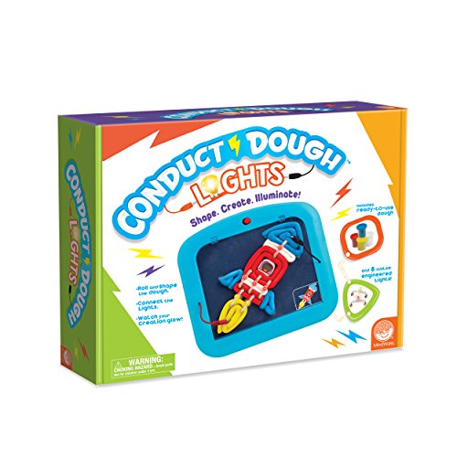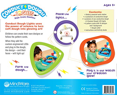 -. Feature : Conduct Dough Lights from MindWare uses the power of science to turn soft-dough designs into glowing works of art. This unique kit is a safe and fun way to introduce the basics of circuitry to young and bright minds. / Children mold the soft, squishy dough into fun objects by following pattern cards or creating their own design. Once the dough is formed, use the included dough cutter to cut the dough in half or shorten pieces that are too long. / Once the design is complete position the custom-engineered LED lights, plug in the wires and watch your creation glow! / The included guide offers several activities for your child to perform as well as detailed explanation of all the items in this kit. / INCLUDES: Battery-powered work station, 3 containers of conductive dough, 1 container of non-conductive dough, 8 Conduct Dough LED lights, 8 double-sided pattern cards, dough cutter, instructions and activity guide.