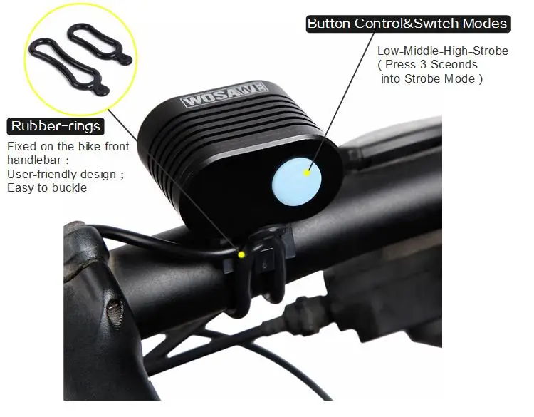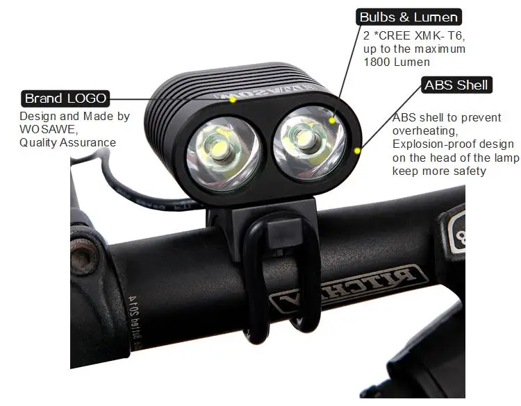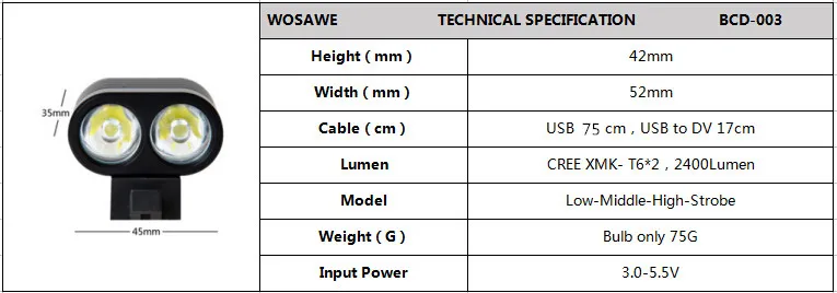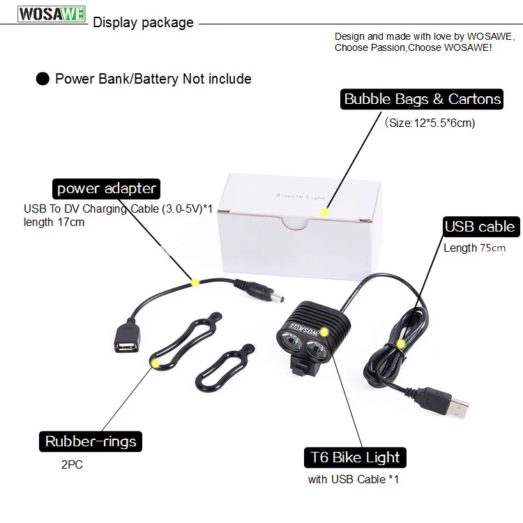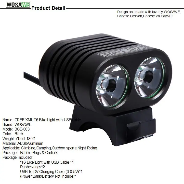 Certification:None Mounting Placement:Handlebar Brand Name:WOSAWE Model Number:BCD-003 Power Supply:Power Bank Name:CREE XML T6 Bike Light with USB cable Material:Aluminum Applicable:Climbing, Camping, Outdoor sports,Riding Package:Bubble Bags&Cartons