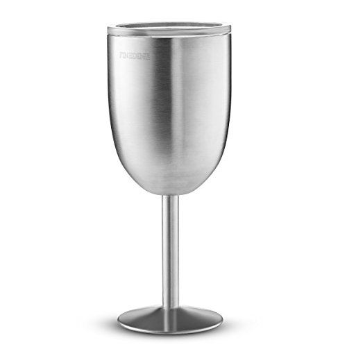 FineDine Premium Grade 18/8 Stainless Steel Wine Glasses 12 Oz. Double-Walled Insulated Unbreakable Goblets (Set of 2) Stemmed Wine Glass BPA-Free Leak Resistant Lid for Red White Wine, Brushed Metal