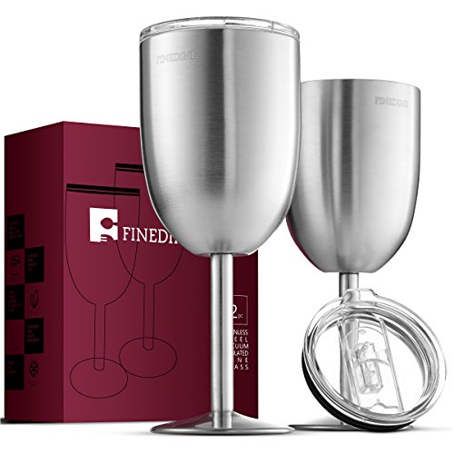 FineDine set of 2 modern elegant stainless steel wine glasses with spill-resistant lid adds a contemporary twist to your wine glass collection. These tumbler wine glass are double wall insulated, feature a bpa-free clear lid and non-slip base that’s perfect for travel, the outdoors, boating, and more!