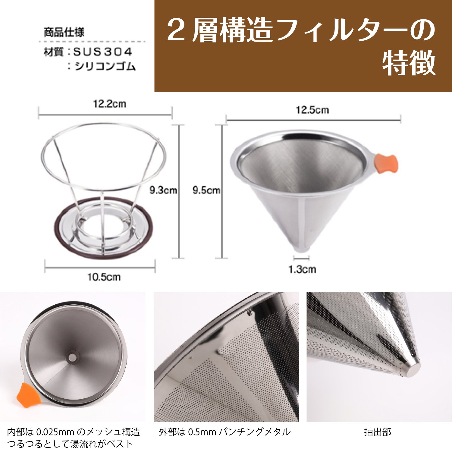 · The inside of the filter is fabricated with a 0.025 mm mesh hole and the outside is made with a 0.5 mm punching metal hole.