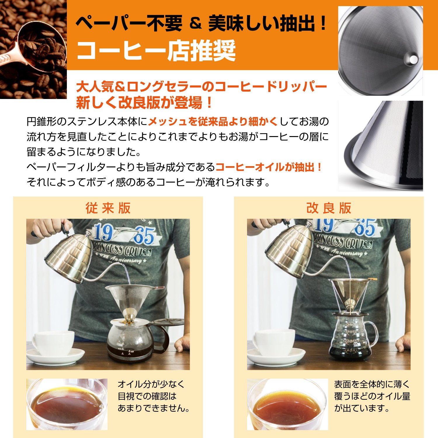 Just change from a paper drip to a stainless steel filter, you can enjoy a completely fresh coffee.