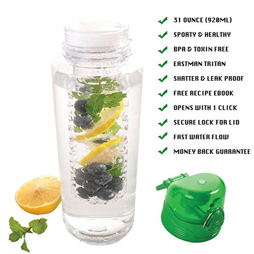 Tired of drinking bland-tasting water day after day? Want to add a little "zest" to your typical beverages? Well, if so, our infused water bottle is perfect for you! This water infuser allows you to easily add fruit or another flavor source to your beverage to create new taste sensations that you will love to drink. For example, just fill this infused water bottle with liquid and then add fruit slices to the water infuser cage, shake well and drink! You'll love the taste and you'll love the potential health benefits that come with adding fruit to water! This infused water bottle is great for use at the gym or when traveling or just at home. It's also great for detox and weight loss programs and can help ensure you are getting essential vitamins and minerals from fruit. Check out what these great benefits: EASY-TO-USE - Everything from the flip-top spout to the removable water infuser cage to the strainer make this infused water bottle easy to use and highly effective! CREATE TASTY, HEALTHY BEVERAGES - Just fill this infused water bottle with liquid and then add fruit or another flavor source, shake well and drink! You'll love the taste and you'll love the potential health benefits that come with adding fruits to water! SAFE - This infused water bottle is BPA-Free! It is also dishwasher safe and easy to clean! FREE BONUS - Order today and receive a Free Ebook! Get your infused water bottle today. Just click the add to cart button above.Feature