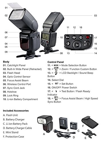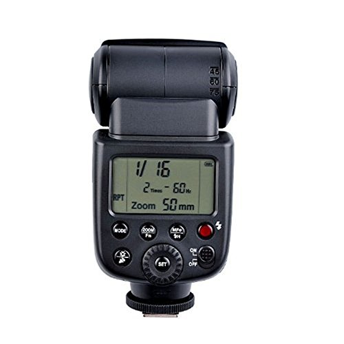 - Feature : GN58(m ISO 100, 105), short flash duration, long working distance. / Recycle time at full power only need 1.5s, faster than the same kind flash. / Flash Mode: Manual Zoom from 24 to 105 mm / Power Supply: Lithium-ion polymer battery pack (Model: VB-18) / Compatible with Canon, Nikon, Pentax, Olympus or other type camera with standard hot shoe.