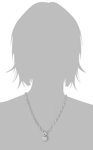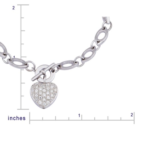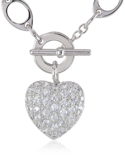 This fashionable heart necklace is made from rhodium-plated sterling silver and shimmering cubic zirconia. The unique, trendy design features a big, thick, brightly polished chain that fastens in front with a toggle clasp. A sparkling cubic zirconia studded heart, with a slight puff shape and filigree back, dangles from the clasp.