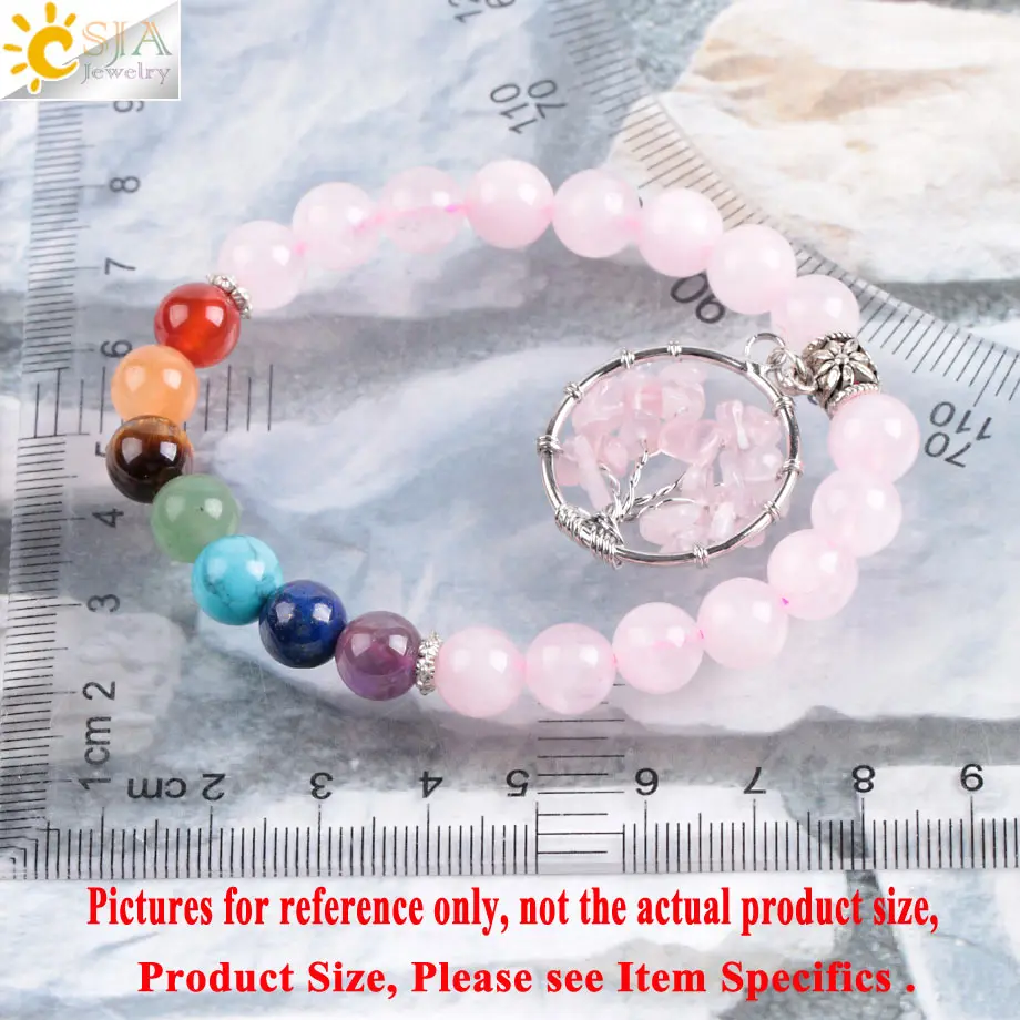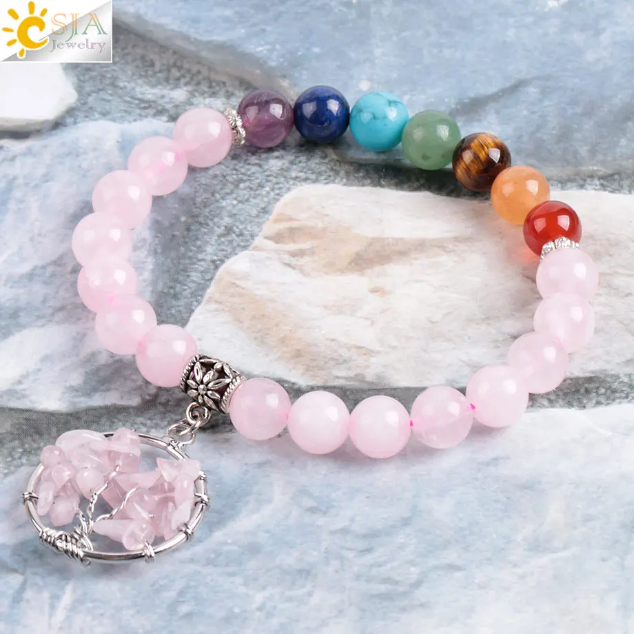 Bracelets Feature:7 Chakras Round Stone Beads + Tree of Life Chip Pendant