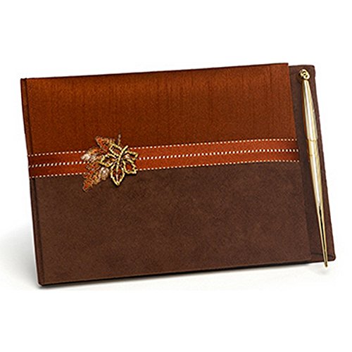 - Brown guest book of faux suede material with textured fabric and satin ribbons. Rhinestone adornment set against an embroidered leaf accent. Records 500 signatures. 9 1/2in. x 6 1/2in. Attached gold-tone pen writes in black ink.
