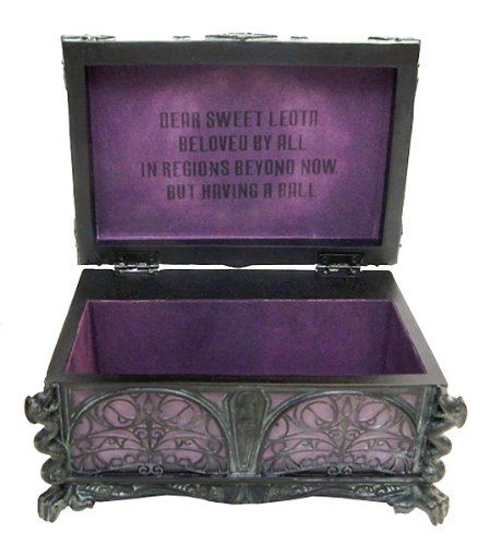 - Feature : Casket case Madame Leota's graven image, as featured on her tombstone, is dead center of this Haunted Mansion Jewelry Box's lid. Finely detailed, the casket-styled box plays Grim Grinning Ghosts and features Leota's epitaph inscribed inside