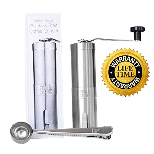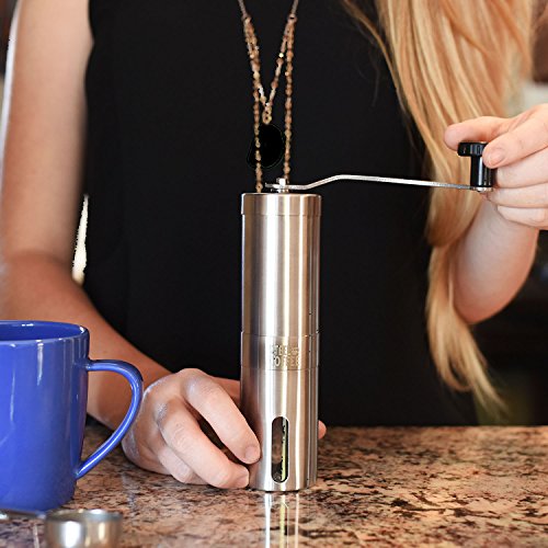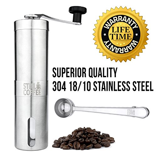 -. Feature : ✔ ★★ THE MANUAL COFFEE GRINDER EXPERIENCE IS FOR THE PICKY COFFEE CONNOISSEUR ★★ DON'T BE FOOLED BY CHEAP IMITATIONS. Gone are the days when the electric Grinder's high pitch squeal screams at you while pulverizing your perfectly roasted coffee beans. Now you can gently, consistently create the perfect Grind for any type of brewing system, including the compatible Aeropress, French Press or Pour Over Dripper. / ✔ STOP BURNING YOUR BEANS ★★ High speed coffee bean grinders burn and annihilate your precious beans. Our Steel Coffee Manual Coffee Grinder will slowly grind your beans to the perfect consistency for the most aromatic, precision-perfected coffee experience. / ✔ THE PERFECT CUP ANYWHERE ★★ Our Manual Coffee Grinder is sleek, strong and for the minimalist. The Steel Coffee Grinder is 18/10 304 food grade, top of the line, stainless steel so it's not only red but it's compact and travels with you anywhere - so your preferred grind, combined with your Pour Over Dripper or French Press makes your special, personal cup of coffee wherever you go. / ✔ NO POWER NO PROBLEM ★★ When the power goes out the electric grinders, automated and drip machines are out of business and the Steel Coffee Grinder keeps on grinding on. / ✔ SLOW DOWN AND SMELL THE COFFEE ★★Break free of some of life's automation and start, or interrupt, your day with the "Zen like" experience of the Manual Coffee Grinder. Take the few extra minutes to take a breath and, literally, smell the coffee. Oh, and we feel so confident that you'll love it, Steel Coffee has a 100% Satisfaction Guarantee. No questions asked. Period.