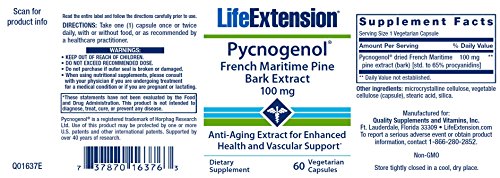 Pycnogenol French Maritime Pine Bark Extract is a time-tested anti-aging solution. This natural plant extract contains procyanidins, bioflavonoids, and other beneficial molecules that help the body fight five processes associated with premature aging. Forty years of studies on Pycnogenol have helped validate its powerful anti-aging properties. The constituents in Pycnogenol have a synergistic effect against factors associated with premature aging, working together to: •Promote the integrity and normal characteristics of cell membranes. •Support healthy DNA function through enhanced antioxidant activity and other potential mechanisms. • Promote a healthy inflammatory response through normal modulation of cytokine molecules. • Fight oxidative stress by encouraging healthy and normal function of antioxidant systems that help inhibit free radical activity and protect DNA. • Encourage healthy cellular metabolism of sugar, healthy blood sugar levels, normal absorption of sugar in the intestine, and post-meal blood sugar levels already within the normal range. This is truly a one-stop formula that can help you beat Father Time at his own game. Add Pycnogenol to your anti-aging regimen today.Feature