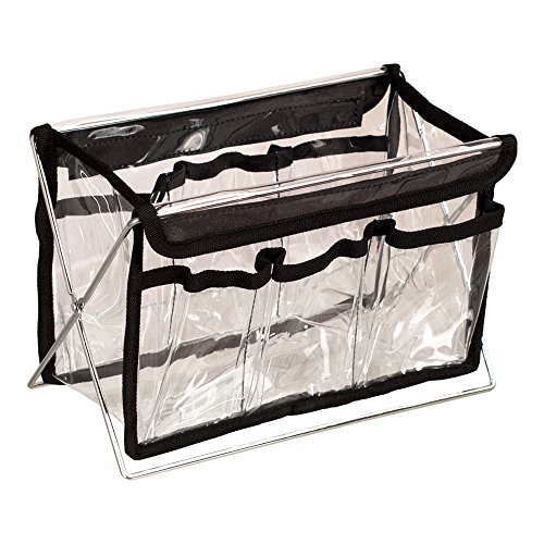 High quality clear vinyl and construction for extra durability. Clear see through design for easy find and fast access to what you need. Foldable metal stand for easy storage. Six external pockets for easy organization of craft accessories. Spacious interior to fit larger tools and accessories. Easy to clean interior and weatherproof. External pocket dimension (LxWxH): 4.5" x 2.25" x 1". Main compartment dimension (LxWxH): 10" x 4.5" x 6.5". Overall case dimension (LxWxH): 10.75" x 6" x 7". Quantity / Carton: 24 pcs.Feature