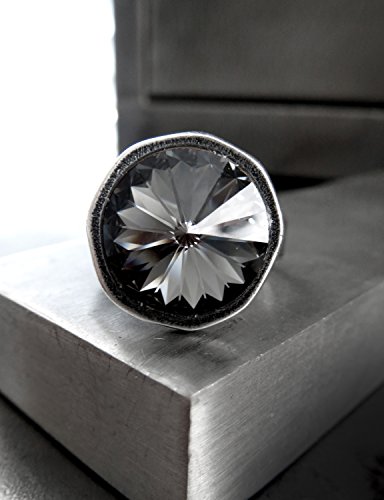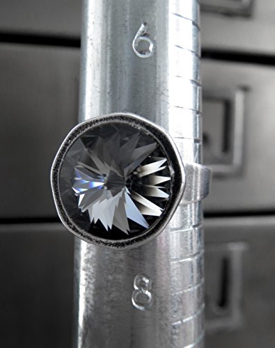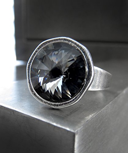 -. Title : Black Night Crystal Ring, Swarovski Crystal with Antiqued Silver Plated Cast Adjustable Ring Band