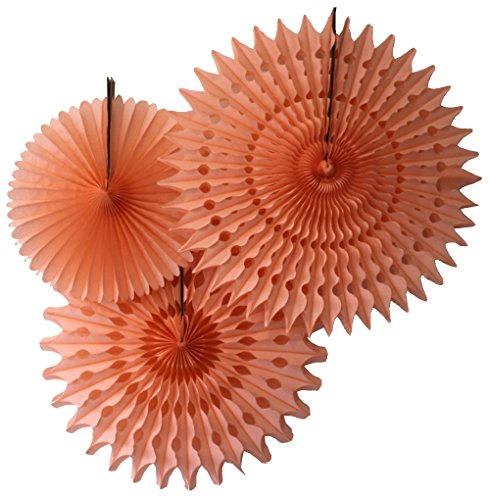 - Beautiful set of three peach honeycomb tissue paper party fans - one 13 inch fan, one 18 inch fan, and one 21 inch fan