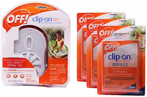 -. Brand : OFF! -. Color : White -. EAN : 0730750800949 -. Feature : Provides mosquito protection without putting anything on your skin / Protects against mosquitoes that may carry West Nile Virus / Quiet, battery-powered fan circulates repellent all around you / Uses an active ingredient with no scent; each refill provides up to 12 hours of head-to-toe protection / No Spray, No Mess,Clip it on: To your belt, to your bag, or set it next to you -. Label : Off -. Manufacturer : Off -. MPN : O71705-1/O70319-3 -. PackageQuantity : 1 -. PartNumber : O71705-1/O70319-3 -. ProductGroup : Lawn & Patio -. ProductTypeName : OUTDOOR_LIVING -. Publisher : Off -. Studio : Off -. Title : Off! Clip on Fan Circulated Mosquito Repellent, White Starter Kit, 3 Refill Packs -. UPC : 730750800949