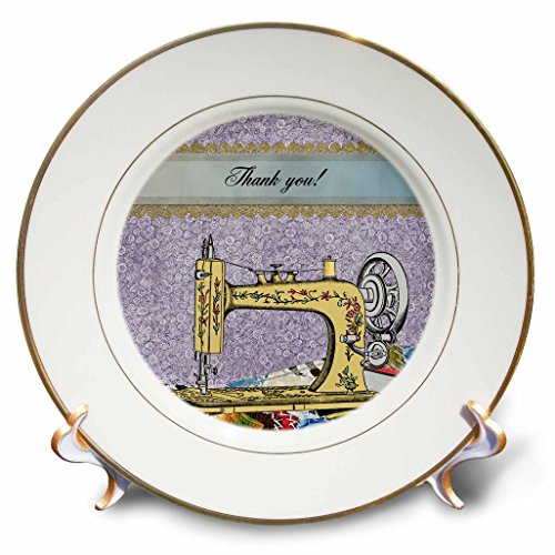 3dRose cp_179324_1 Vintage Flowered Yellow Sewing Machine with Colorful Quilt, Thank You Porcelain Plate, 8"