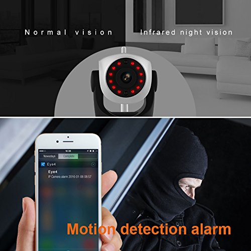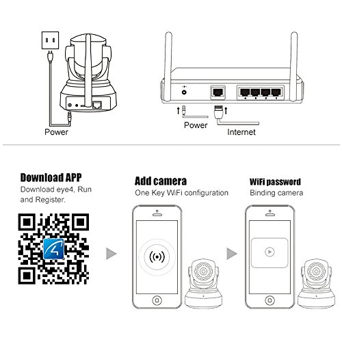 -. Feature : Eye4 APP SETTING - scan the QR code or search key words "Eye4" in AppStore or GooglePlay to download the Eye4 App. After setting, you can easily operate this home security camera (under 2.4 G wifi only) / ANGLE ADJUSTABLE - Pan: 270 degree, Tilt: 80 degree to cover every corner at home and record by 1080P full HD photo and video / MOTION ALARM- with real-time App push notifications , email alert, FTP upload. So it is convenient to know home security condition through web connecting of camera / NIGHT SIGHT - with 12 pcs infrared night vision light, IR-CUT switch distance can up to 10 meters ,ensure to get HD image in dim and dark place / CUSTOMER SUPPORT- it supports Android and IOS system mobile devices (don't support windows APP). Any issue, you can email to our Customer Service