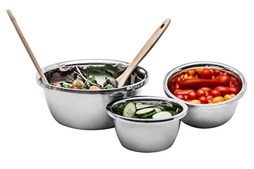 VARIETY OF QUART SIZES - graduating sizes of 1.16 1.7 2.22 2.9 3.7 and 4.2 qt allows users to be well equipped for serving fruit salads, marinating for the grill and adding last ingredients for dessert. The smaller bowls are great for whisking and beating smaller quantities, while the large metal bowls are ideal for mixing larger baking batters, cake dough, tossing salads, marinating and food storage. Stain-less steel construction is excellent for durability and temperature retention.
