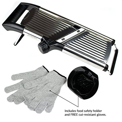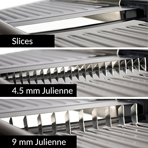 - HOW WE’RE DIFFERENT: ADJUSTABLE, BUILT-IN BLADE - make cuts on the fly with our adjustable blade dial. No storage headaches with extra blade inserts. All slicing options are built right into our device. Slice from extremely thin to 9mm thick. Two julienne settings - 4.5mm and 9mm. YOUR FINGERS ARE PRIORITY - we include cut-resistant gloves. A blade guard for storage. A food safety holder for use during slicing. A specially designed safety cleaning brush. The ONLY SLICER to offer these bonuses.