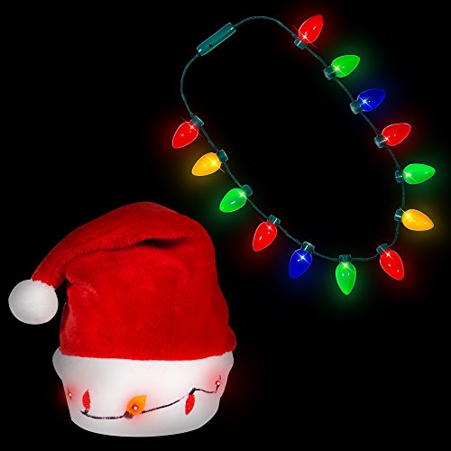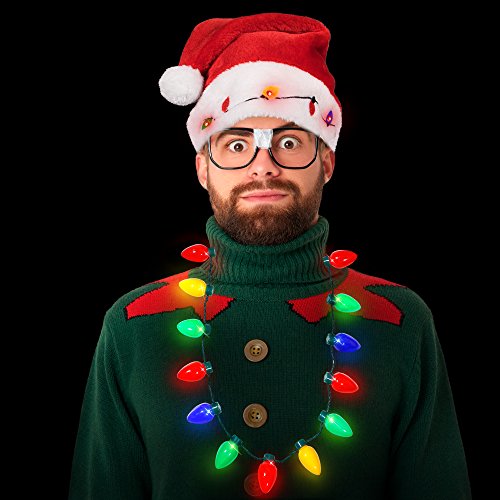 Studio : Windy City Novelties Publisher : Windy City Novelties Binding : Health and Beauty Product Description Feel like a real jolly ole St. Nick and take your Christmas spirit to the next level with our LED Xmas Bulb Flashing Santa hat and LED light up Christmas necklace combo. Each kit includes a plush Red Santa hat, which features a festive traditional bulb pattern across the white plush brim which lights up by a simple press of a button. Christmas hats for adults and kids make great additions to any ugly sweater Christmas outfit! The LED light up Christmas necklace completes the ensemble and features an assortment of brightly colored LEDs with 3 flashing modes to put anyone in the spirit of Christmas! 0