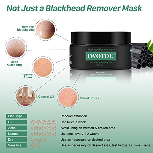-. Feature : Deep Cleansing - Iwotou Blackhead Remover Mask gently dissolves and peels away blackheads, dirties, excess oils and other impurities, while minimizes pores and improves skin texture, leaving skin ultra-clean, fresh, bright with a healthy, youthful glow. / Nature Ingredients - Activated bamboo charcoal, known as "black diamond", is the most eco-friendly, effective and nature skin purifier. It acts like a magnet to draw out the most deeply-rooted impurities. This ingredient is carefully collected from the most active molecules of the plant, and extracted via advanced bio-engineering technology and the unique cosmetics production process. / Tighten pores - Upgraded Formula peel of mask has unique strong absorption and deep cleaning function, could remove stubborn stain or oil spots on face, will make your pores smaller after single use. / Powerful Antioxidants - The peel-off mask contains powerful antioxidants that protect the skin while balancing the skin for a beautiful complexion. / Perfect for all skin type - Iwotou black mask effectively clean the blackheads, whiteheads, acne, oil spots on the face and work well on strawberry nose. Blackhead remover mask helps exfoliate away dulling skin cells for softness and clarity.