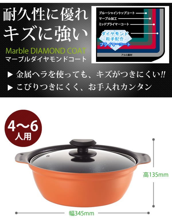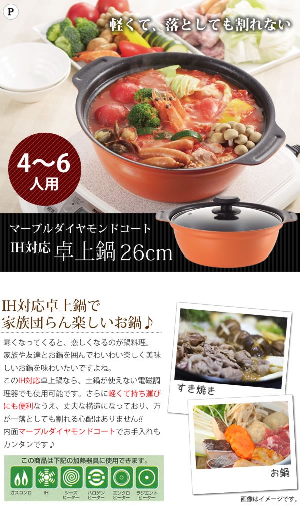 | <h1>軽くて持ち運びにも便利な卓上鍋でお鍋を囲む機会も増えそう♪わいわい楽しくお鍋を囲んだ後のお手入れも内面マーブルダイヤモンドコートで簡単です。</h1> |