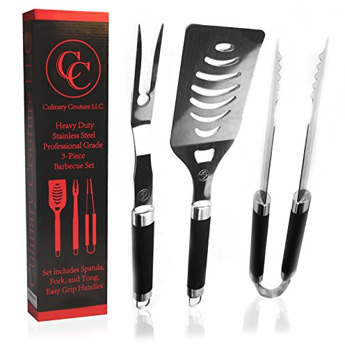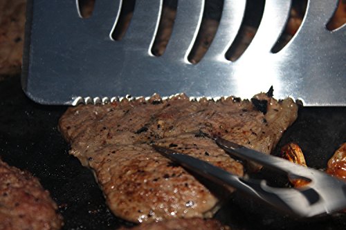 - PROFESSIONAL GRADE 3-PIECE SET: Heavy duty spatula with serrated edges helps rip large pieces of meat. The spatula boasts an oversized head to easily handle large pieces of steak. Long non-slip handles keep you far away from the grill heat. Once you're all done grilling your masterpiece, convenient loops have been designed for easy hanging.