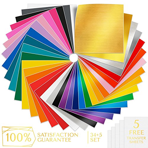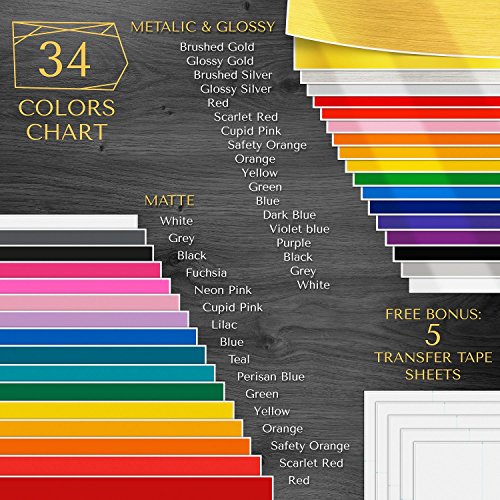- • 4 DIFFERENT FINISHES WITH LARGE VARIETY: This vinyl sheet set contains 4 different finishes: 15 Matte Sheets, 15 Glossy Sheets, 2 Metallic Brushed Sheets, and 2 Metallic Glossy Sheets. You also get 5 transfer tape sheets for FREE! Our adhesive vinyl sheets are of the highest quality, so you can use them anywhere you like! Our set comes in 34 different colors! No duplicates!