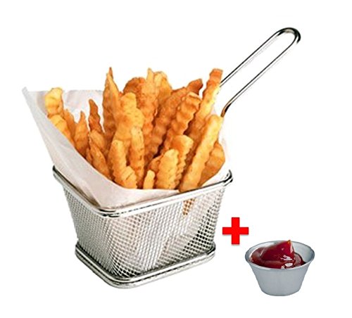 This Mini fry baskets Great for french fries, mozarella sticks, chicken fingers, onion rings, etc... fried food,and the sauce cup a perfect to present the tomato salad sauce when serving food on table, a perfect food serving set and make an funny impact when entertaining guests.