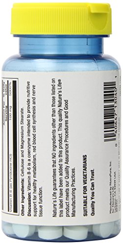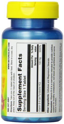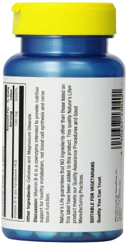 -. Binding : Health and Beauty -. Brand : 3M -. Label : Nature's Life -. Manufacturer : Nature's Life -. ProductGroup : Health and Beauty -. ProductTypeName : HEALTH_PERSONAL_CARE -. Publisher : Nature's Life -. Studio : Nature's Life -. Title : Nature's Life B-6 Tablets, 100 Mg, 50 Count