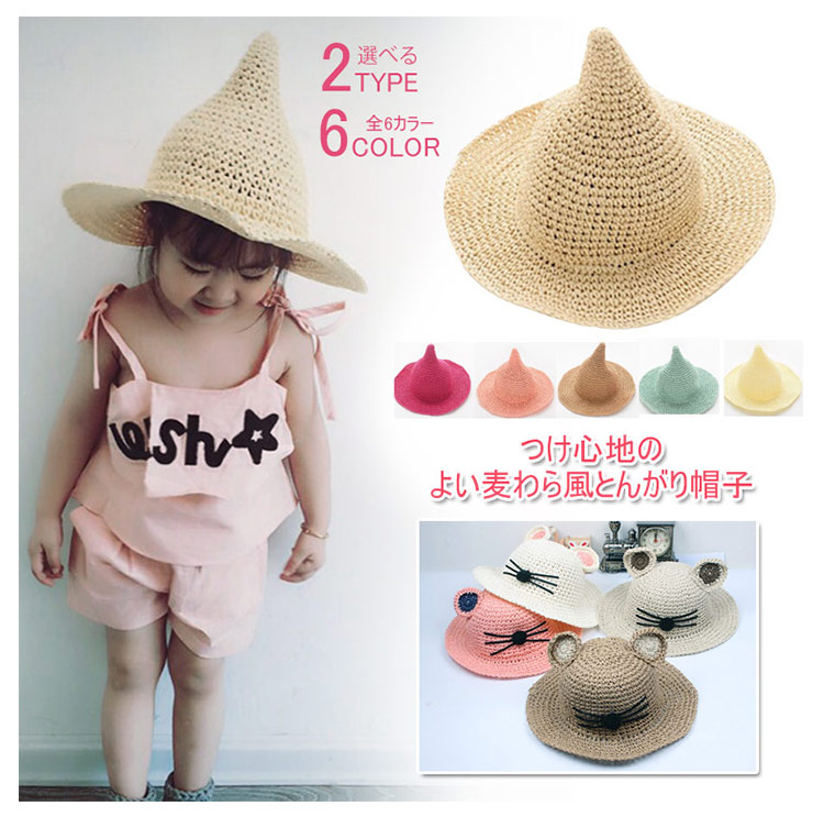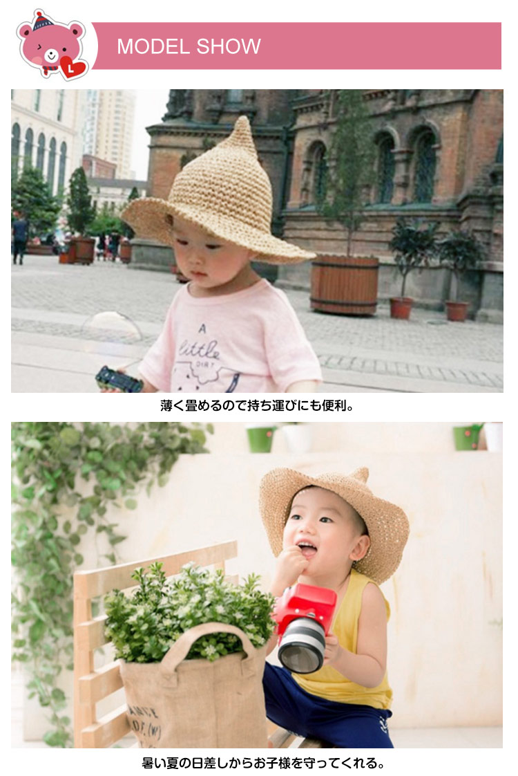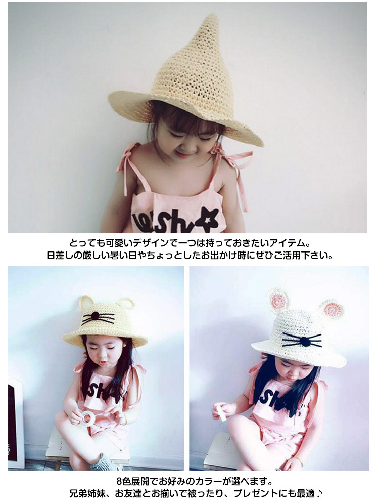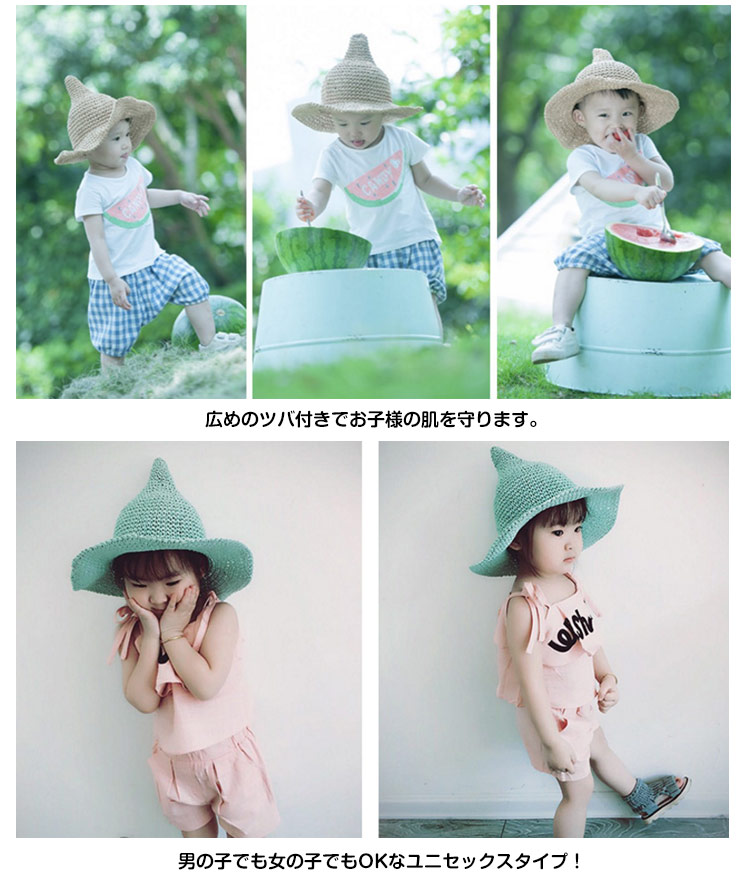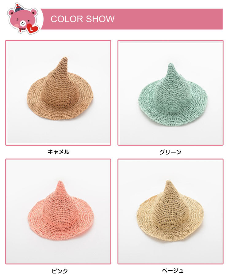 | つけ心地のよい麦わら風とんがり帽子薄く畳めるので持ち運びにも便利。暑い夏の日差しからお子様を守ってくれる。広めのツバ付きでお子様の肌を守ります。男の子でも女の子でもOKなユニセックスタイプ!とっても可愛いデザインで一つは持っておきたいアイテム。日差しの厳しい暑い日やちょっとしたお出かけ時にぜひご活用下さい。8色展開でお好みのカラーが選べます。兄弟姉妹、お友達とお揃いで被ったり、プレゼントにも最適♪ | |