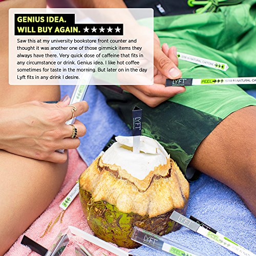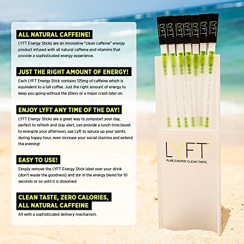 -. Feature : ALL NATURAL CAFFEINE! LYFT Energy Sticks are an innovative "clean caffiene" energy product infused with all natural caffeine and vitamins that provide a sophisticated energy experience. / JUST THE RIGHT AMOUNT OF ENERGY! Each LYFT Energy Stick contains 125mg of caffeine which is equivalant to a tall coffee. Just the right amount of energy to keep you going without the jitters or a major crash later on. / ENJOY LYFT ANY TIME OF THE DAY! LYFT Energy Sticks are a great way to jumpstart your day, perfect to refresh and stay alert, can provide a lunch time boost to energize your afternoon, use Lyft to spruce up your spirits during happy hour, even increase your social stamina and extend the evening! / EASY TO USE! Simply remove the LYFT Energy Stick label over your drink (don't waste the goodness) and stir in the energy blend for 10 seconds or so until it is dissolved. / Clean Taste - Zero Calories - All Natural Caffeine - All with a sophisticated delivery mechanism - Thank you for joining the LYFT revolution!