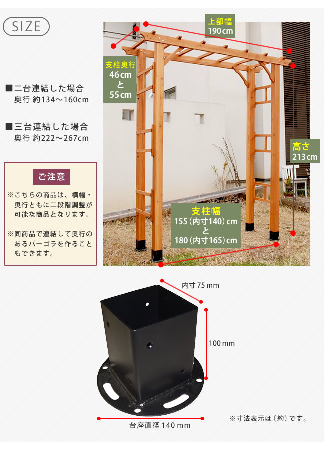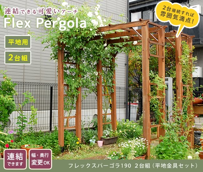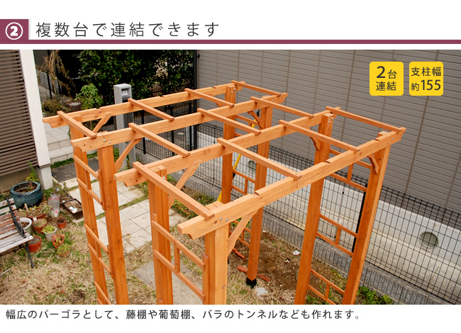 ●幅と奥行を二段階調整できるだけでなく、 同じアーチを連結させて、藤棚や葡萄棚のようなトンネル状のパーゴラを設置することもできます