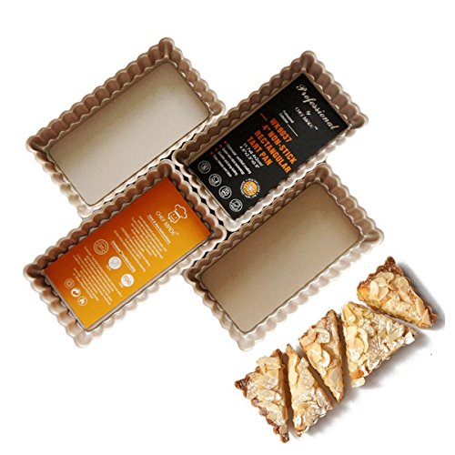 SIZE:Pan exterior dimensions 4.6 x 2.5 x 0.8 inch and interior dimensions 4.1 x 2.1 x 0.6 inch PACKAGE:4 Set 4 Inch Non-Stick Rectangular Tart Pan Use and care 1. Apply to soft tools (silica gel, nylon, etc). Not Apply use sharp metal tools in case of scratch. 2. Not Apply to non-stick spray for cooking use.Please do not bake it without anything in it. 3.Apply oven fridge.Not Apply fire cook microwave electromagnetic oven. 4.Temperature range:-4 ℉~428 ℉ (-20 ℃~220 ℃). 5. Apply Hand wash with mild cleanser in warm water. Use a soft sponge or nylon when necessary.Not Apply dishwasher. 6. Slight scratches on the mold can be used normally without any problems. 0
