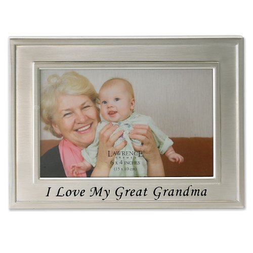 -. Binding : Kitchen -. Brand : Lawrence Frames -. Color : Silver -. Department : Accent -. EAN : 0751148063708 -. Feature : Traditional silver metal frame that will compliment any decor / Constructed of heavy weight metal and silver-plated; includes high quality black velvet backing / Silver plated "I Love My Great Grandma" frame / Wipe clean with dry cloth / Holds 4-inch by 6-inch photo; overall dimensions 7.4-inch by 5.4-inch by 0.6-inch -. IsAutographed : 0 -. Label : Lawrence Frames -. Manufacturer : Lawrence Frames -. Model : 504164 -. MPN : 504164 -. NumberOfItems : 1 -. PackageQuantity : 1 -. PartNumber : 504164 -. ProductGroup : Home -. ProductTypeName : HOME -. ProductTypeSubcategory : other-professional-frames -. Publisher : Lawrence Frames -. Size : 4 by 6-Inch -. Studio : Lawrence Frames -. Title : Lawrence Frames Brushed Metal 4 by 6-Inch I Love My Great Grandma Picture Frame, Sentiments Collection -. UPC : 751148063708 -. Warranty : Parts