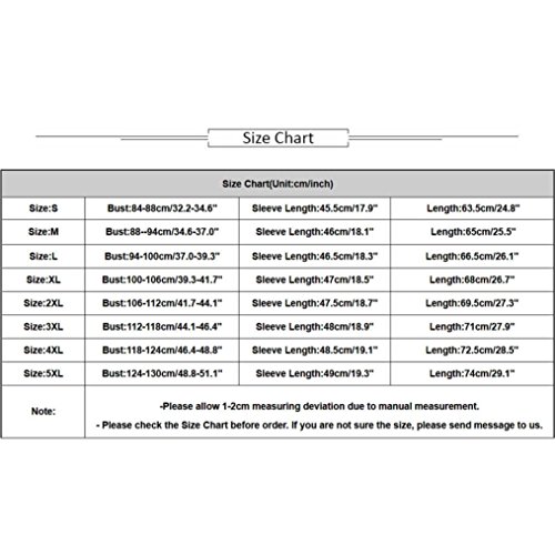 ?Asian Size Chart(Unit:cm/inch) ?Size:S _ Bust:84-88cm/32.2-34.6" _ Sleeve Length:45.5cm/17.9" _ ?Length:63.5cm/24.8" ?Size:M _ Bust:88--94cm/34.6-37.0" _ Sleeve Length:46cm/18.1" _ ?Length:65cm/25.5" ?Size:L _ Bust:94-100cm/37.0-39.3" _ Sleeve Length:46.5cm/18.3" _ Length:66.5cm/26.1" ?Size:XL _ Bust:100-106cm/39.3-41.7" _ Sleeve Length:47cm/18.5" _ Length:68cm/26.7" ?Size:2XL _ Bust:106-112cm/41.7-44.1" _ Sleeve Length:47.5cm/18.7" _ Length:69.5cm/27.3" ?Size:3XL _ Bust:112-118cm/44.1-46.4" _ Sleeve Length:48cm/18.9" _ Length:71cm/27.9" ?Size:4XL _ Bust:118-124cm/46.4-48.8" _ Sleeve Length:48.5cm/19.1" _ Length:72.5cm/28.5" ?Size:5XL _ Bust:124-130cm/48.8-51.1" _ Sleeve Length:49cm/19.3" _ Length:74cm/29.1" 0