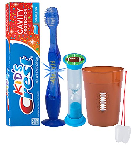 -. Feature : Turn something your kids have to do into something they want to do...Because when brushing is fun, it gets done! / (1) Firefly Youth Flashing Lights Suction Cup Toothbrush (Assorted Colors) (1) Kids Crest Cavity Protection Sparkle Fun Toothpaste, 2.7 oz / (1) Football Themed 22 oz Plastic Mouthwash Rinse Cup, Doubles As Toothbrush Holder! / (1) Dentist Recommended 2 Minute Football Themed Brushing Timer (Assorted Styles) / Plus Bonus "Remember to Brush" Visual Aid Tooth Saver Necklace. Hang it in their bathroom or by their bed so they remember to keep their chompers sparkly fresh. You could also use these tooth charms to save one of your child's baby teeth.