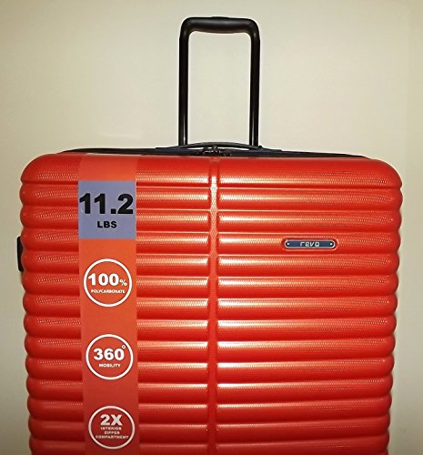 -. Brand : Revo -. Color : Orange -. Department : unisex-adult -. EAN : 0618842313815 -. Feature : Durable 100% Polycarbonate hardside exterior with textured glossy finish, modern aluminum telescopic handle system, with push-down locking for easy, single-hand use; top & side carry handles / 4 dual wheel spinner system provides the smoothest and most effortless movement for your life on the go, overlapping and lockable zipper pulls / Black finish accents and zipper pulls, fully lined interior with 2 zippered divider compartments to separate & organize clothes / Large interior zip pocket for toiletries, etc; exterior side protective feet / Zippered 2.0" expansion for added packing capacity; Dimensions: 32.0" high x 22.0" wide x 12.0" deep - expands to 14.0" deep; Weight: 11.2 lbs -. HazardousMaterialType : Unknown -. Label : Revo -. Manufacturer : Revo -. Model : 19320-90-30 -. MPN : 19320-90-30 -. PackageQuantity : 1 -. PartNumber : 19320-90-30 -. ProductGroup : Single Detail Page Misc -. ProductTypeName : MISC_OTHER -. Publisher : Revo -. Size : large -. Studio : Revo -. Title : Revo Pipeline 30" Expandable 100% Polycarbonate 4 Wheel Spinner Lage Orange -. UPC : 618842313815
