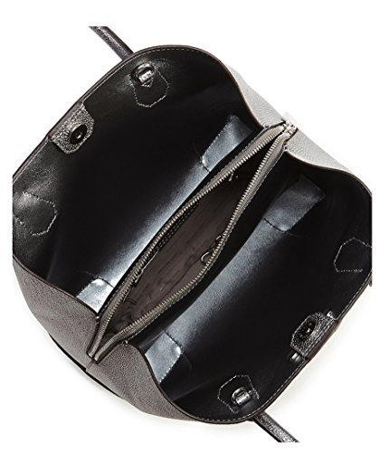Logo lining; zip and slip pockets. Open top with center snap closure. Exterior, hanging padlock; logo lettering. Center zip compartment divides interior.