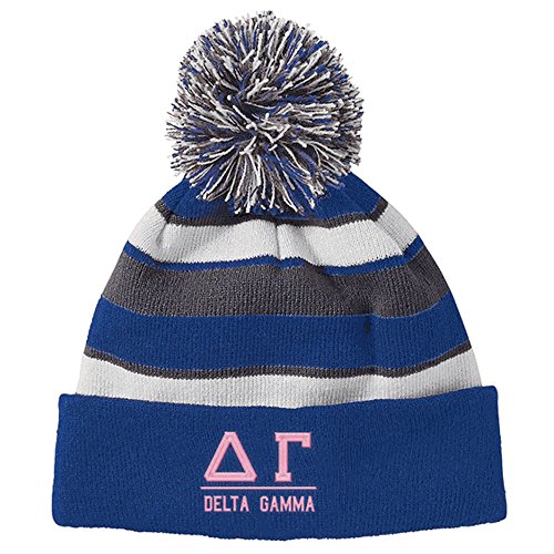 Product DescriptionDelta Gamma Greek Comeback Beanie Warm and soft 100% acrylic rib knit Tri-color pom-pom detail on top Folded hem Fit type: One size0