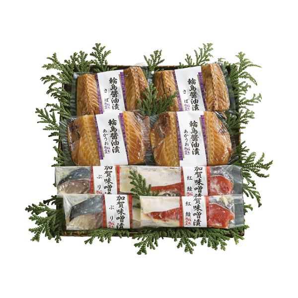 ●江戸時代創業の老舗、㈱直源醤油が作る甘味のある 油たれに、じっくりと漬込み干し上げた輪島朝市でも人気の 油漬、と城下町金沢で造る加賀味噌に漬込んだ、加賀味噌漬をセットしました。
