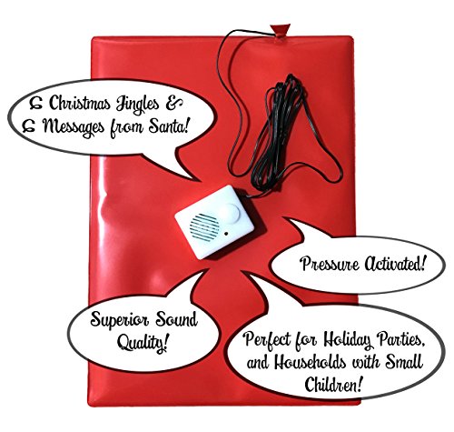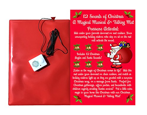 Our Magical Christmas Doormat will have you in the Holiday Spirit in no time. Just place this Christmas door mat under your regular doormat at the entrance to your home and watch the magic begin. Once your visitor steps on the doormat the hidden Magic Doormat will sound off with 12 amazing Holiday sounds. Includes 6 Familiar and popular Christmas jingles and 6 Santa Sounds and Sayings. Each time you press on the mat it will sound off with a different fun Santa sound or Christmas jingle. Place our AWESOME mat at the front door or near your Christmas tree for full effect. A great way to welcome your Holiday guests. The mat is red and merry so your entire family can enjoy the Holiday sounds. This Christmas doormat is best used indoor. This is the best Christmas Doormat with sound!! What better than a singing Christmas doormat.
